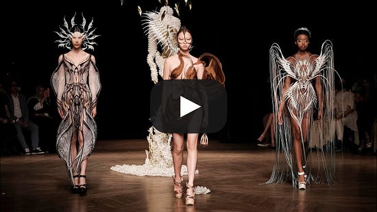 The allusion to Daphne and Apollo is betokened through the finale look, embodying the very moment that Daphne transforms into a laurel tree, while the 'Glitched Growth' dress and other looks mimic the alternate stages of Daphne’s metamorphoses, diffusing the creation of plant and bone structures growing together. These looks are designed around body objectification and imagine future metaverse hybrids of Daphne’s myth in which the body is boundlessly transformed and where man and nature are indistinguishable. In keeping with the Maison’s collaborative spirit, this season, Iris van Herpen partners with sculptor Casey Curran, bequething a prospective statue of a future Daphne, bursting from the centre of the runway. Daphne’s sculpture transforms through herbose creatures blooming from her skeleton, at her chest appears a large crevice, revealing her mechanical heart pulsating inside, pertaining to the notion that the elusiveness of identity means that nothing can perish.