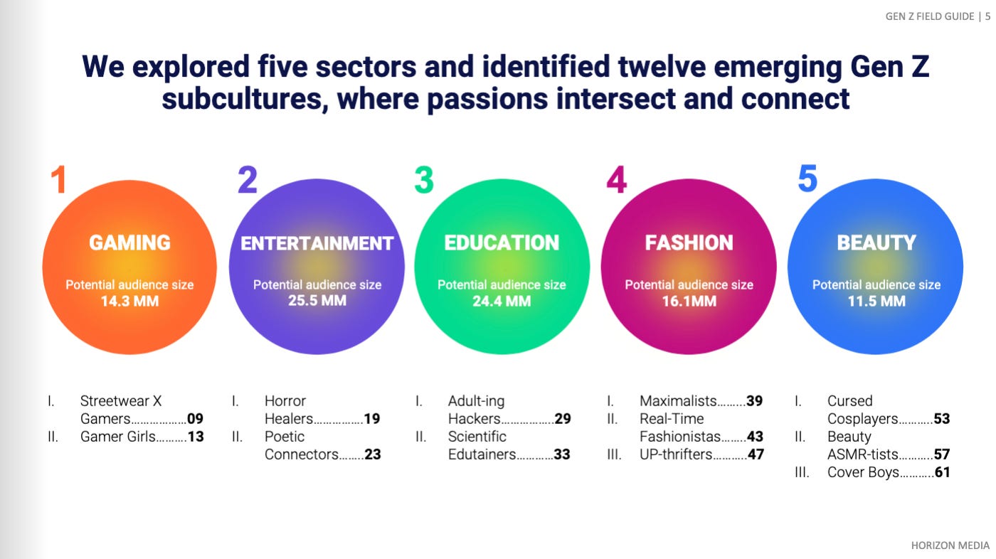 🤳gen z subcultures“in a new study by Horizon Media, 91% of 18–25-year-olds say there's no such thing as 'mainstream' pop culture.” this report feels like a rabbit hole of subcultures with really cool visualizations of the sphere of influence for each subculture. it’s worth taking a look. the five categories and emerging subcultures are: