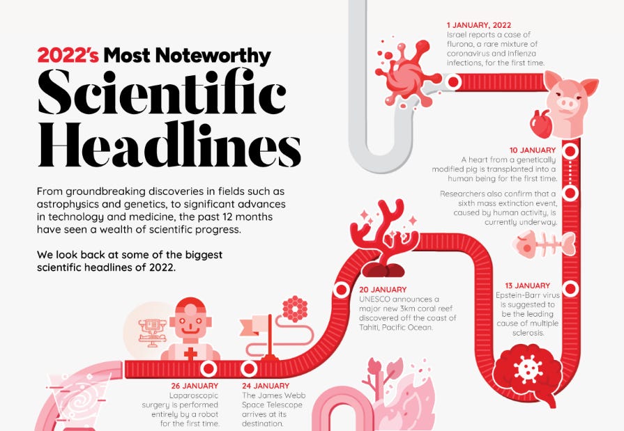 don’t ask me why, but i was just so obsessed with this and it has become one of my favorite songs. i hope you like it. i added it to my 👨🎤you upload yourself to San Junipero and go party at The Quagmire🤘playlist. 🔬scientific headlines 2022i clicked on this expecting a purely uplifting post full of scientific breakthroughs of 2022. i was naïve. even if they were there, i was surprised at the number of headlines about the global emergency. i recommend going there to navigate through the whole infographic. 🔭2023 resolutions and predictionsRADAR’s 2023 predictions resolutions are looking so good 😍😍 thank you, Danilo Novais, for sharing them with me. it was so nice to see many of the themes i have shared here in the nexialist weaved in such a neat way, proposing these resolutions. play, hopepunk, anti-ambition, third places, accountability - _washing, grief, community care > self-care, plural identity… it is an inspiring treat for 2023. they also let us navigate in their miro board. check it out. 🗡️kill billSZA’s new album SOS has been a blessing and this new video is everything. so cinematic, nostalgic and sexy. the last scene is to die for. 📿give it upthis song appeared in my feed and i fell in love. dream-artsy-pop, there’s no way not to love it. MOTHERMARY is an American duo of twins, the last children of many from a Mormon family. you got to enjoy the blasphemy of it.