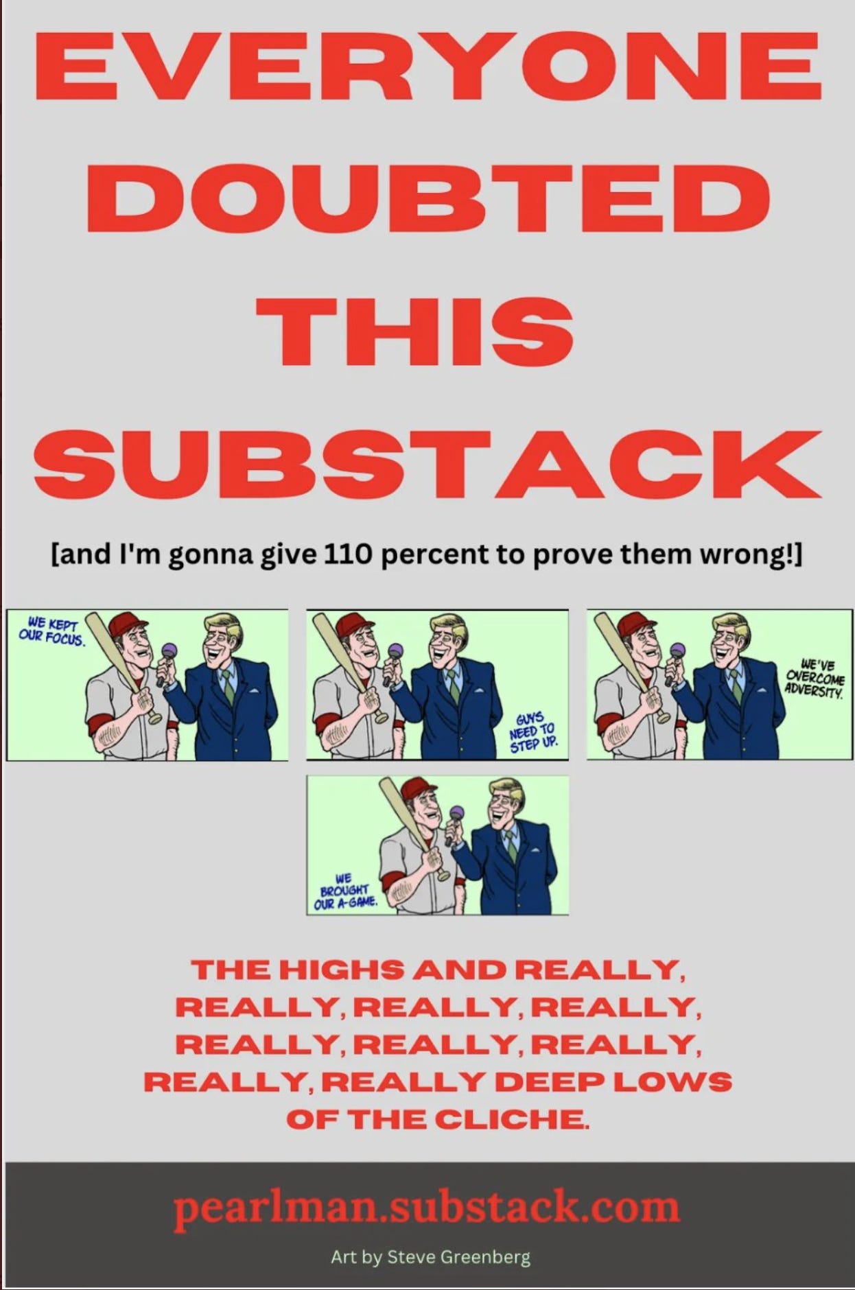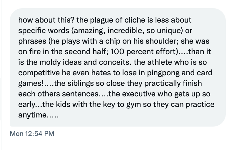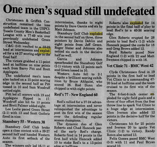 The Yang Slinger: Vol. XXVIIIAll writers are warned to avoid the cliches. So why do we keep returning to them—and is there a larger picture we're sort of missing? Also, five questions with ESPN's T.This is the Substack entry you’ve been waiting for. It’s the Substack entry nobody ever believed I could write. It’s the Substack entry that shows the little guy—in this case, a Jewish writer out of the University of Delaware with unnaturally long arms and a probation officer mother—can bark with the big dogs. It’s the Substack entry that proves I’ve got the heart of a lion. It’s the Substack entry that proves I’ll never say never. I’ll never die. I’ll soldier on. It’s the Substack entry that’ll take you behind the scenes to the local hospital, where—when I’m not giving everything I’ve got to this essay—I’m finding time for little Joey, the lisp-plagued, cleft-palated orphan who lost his left leg in a tragic bass fishing accident. Because, deep down, I’m the Substack writer who cares. And you need to know that. For me, this Substack isn’t about the money. For me, this Substack proves defense wins championships. For me, this Substack shows I’m a team player. I’m a family-first guy. I play through pain. My body is a wrecking ball. I never cough up the rock. I believe time will tell. I will avoid writing a bad Substack entry like the plague. Because this Substack entry concerns cliches. And. It’s. A. Born. Winner. [motherfucker!] Back in 1985, when she was covering the NBA for the Detroit Free Press, Johnette Howard committed the unforgivable, one-of-a-kind offense of writing that a player had “exploded” for 40 points. It’s the sort of thing no sports scribe would ever do—except for, eh, pretty much every single sports scribe who has ever spent time on the planet. A quick newspapers.com search for “sports” and “exploded for” brought back a mere 1,082,424 matches. And while some of those probably involve the unfortunate explosion of a car or human or pig, a high percentage were produced by writers paid to use words to describe sporting events. My personal favorite appeared in the Dec. 11, 1990 edition of the Tooele Transcript Bulletin (in Tooele, Utah), where a mercifully un-bylined article with the head ONE MEN’S SQUAD STILL UNDEFEATED included one … two … three(!) explosions. Thankfully, the accompanying photograph of Toole guard Jordan Nigh (see above) served as proof that not all of the town’s youth basketball players had their torsos detached from their limbs. But there was concern. I digress. Johnette Howard went on to become one of our generation’s great sports scribes—a woman who has written for the National and Sports Illustrated and ESPN.com and a million other places. But she still possesses the vivid memory of an older colleague leaning in—post-”exploded for”—and saying, bluntly, “Stop it.” “I am also sure that early on I wrote somewhere that someone had a ‘rifle’ arm,” Howard texted me. “I'll have to carry that the rest of my life.” And here’s the thing I want to reemphasize about cliches: We are all guilty. Not some of us. Not most of is. All of us. “People who use cliches don’t realize it,” Jon Heyman, the New York Post baseball columnist, texted me. He’s correct. We’ve all lazily described Dansby Swanson rifling a throw or Josh Jacobs bowling over a linebacker or some small podunk school showing the world that David can topple Goliath. J.A. Adande was a brilliant writer for the Los Angeles Times who still—16 years later—regrets ending his final newspaper column with, “Nothing lasts forever.” We’ve referred to 100,000 unheroic figures as heroic. We’ve tagged folks legends who, a decade later, walk the Jefferson Valley Mall unnoticed. We call someone “unconventional” because she plays XBox while wearing a ski cap. We say someone is “upstanding and moral” because he attended church. “I don’t know if the following count as cliches but they make me nuts,” said John Feinstein, the Washington Post contributor and biographer galore. “‘Student-athlete’—I instantly distrust anyone who uses it. ‘Very unique.’ No such thing. ‘Coach’ used as a first name … especially ‘Coach Cowher,’ on CBS. ‘Lower (or upper) body,’ injury. Come on. Guy breaks an ankle, tell us. And, finally, the legendary, ‘We’ll have to look at the film.’ Did you watch the damn game?” Bill Werde, the director of Syracuse University’s Bandier Program and a former Billboard editorial director, wisely told me that, “I think every writer either starts out with cliches early in their career, or is lying to themselves about where they started out.” Bill continued: “Just because a woman sings with passion or flair doesn’t make her a ‘diva.’ And chances are, that A- level pop star is not, in fact, an ‘icon.’ Very few of the albums identified in many music pubs as ‘highly anticipated’ actually are, at least by any meaningful number of people, nor are they ‘criminally overlooked.’ If you think a song is ‘ethereal’ ‘bombastic’ or—god help me—‘Beatlesesque’please keep thinking.” Bill is right. Like, 100 percent right. All those things suck. Hell, all cliches suck. But (like starting a sentence with ‘Hell’), we keep returning to them. Scott Adamson, author of “The Home Team: My Bromance with Off-Brand Football,” remembers a long-ago high school career day when Al Browning of the Tuscaloosa News came for a visit. “His favorite [cliche] to hate was “Coughing up the football,” said Adamson. “I remember him saying that if we ever see someone cough up a football, we should ask our editor to send a news reporter to the scene because it was front page material.” For the last 24 years, the website sportscliche.com has maintained a running poll of the most overused sports cliches. As of this week 1,618 people have resp