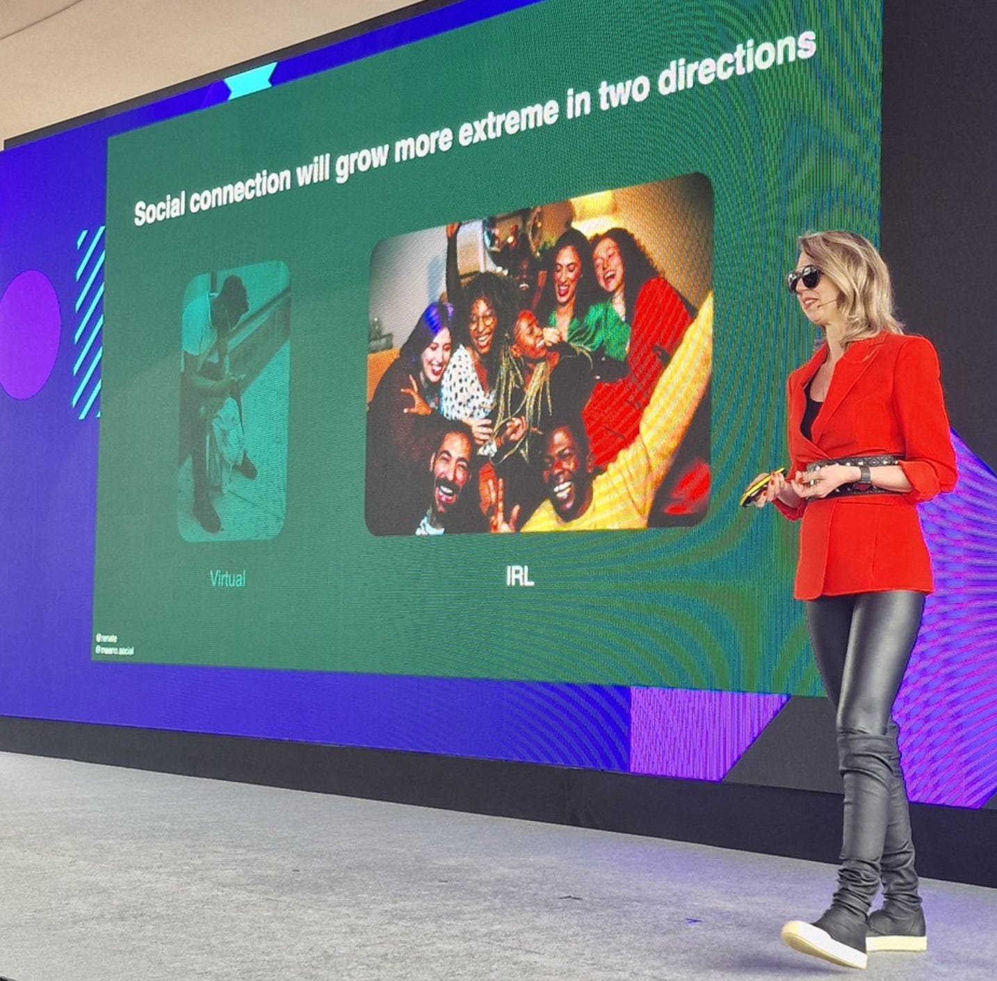 she compared this experience to the use of digital maps. we get so used to it, that we forget to exercise our spatial awareness. and this actually has negative effects on our neural health. for this presentation about maximizing collective intelligence at work, i was late. but she was sharing how to the worst thing you can do for any team, is to hire people that think alike (aka no diversity). according to ming’s research (i tried to unsuccessfully find a link), in this dynamic people are less intelligent/innovative, because they settle for less as they echo each other (even if they are brilliant individually). she talked about this paradox between trust and diversity, which teams need to balance. brainsparks: scenius aka communal genius (tn#31), collective effervescente, egregore (tn#11) 🫂social healthi’m that person that loves the future of relationships talks, and it can be a hit-and-miss in these conferences. i was happy i went to see renate nyborg, the founder & ceo of meeno, an app that uses ai to help with relationship advice (one in three men ask chatgpt for relationship advice… i’m still thinking about this). renate brought some examples and data on how human connection is growing in two directions: virtual and irl. here are some of them: