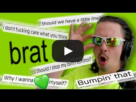 brainsparks: the alpha male myth, colonial masculinity (tn#127), masculinity (tn#48), straight men kiss (tn#95), on heteropessimism (tn#174) 🟩brat reactiontalking about fruity men, i might have a crush on this guy. if you didn’t get brat, this reaction from troy (hthaze) will help you. he explains why it’s sonically rich *aggressively digital,* while he pays attention to the lyrics and i mean, he dances like no one is watching and even cries in a couple of songs. who would have said a straight man could help us understand this queer album. brainsparks: this is how you listen to music (tn#162) 📻the alchemy of popkesha had lost legal rights to her own voice and it took years to gain them back, in a very public dispute. her tedtalk is quite a vulnerable moment, where she explains how songwriting is a way to channel truth (otherwise, it sucks). also, she invites and inspires us all to express our feelings through art.