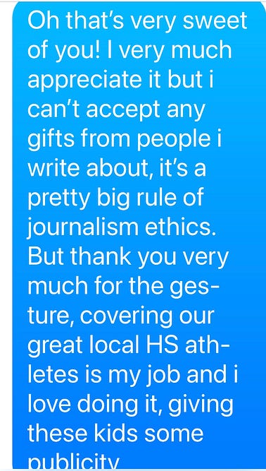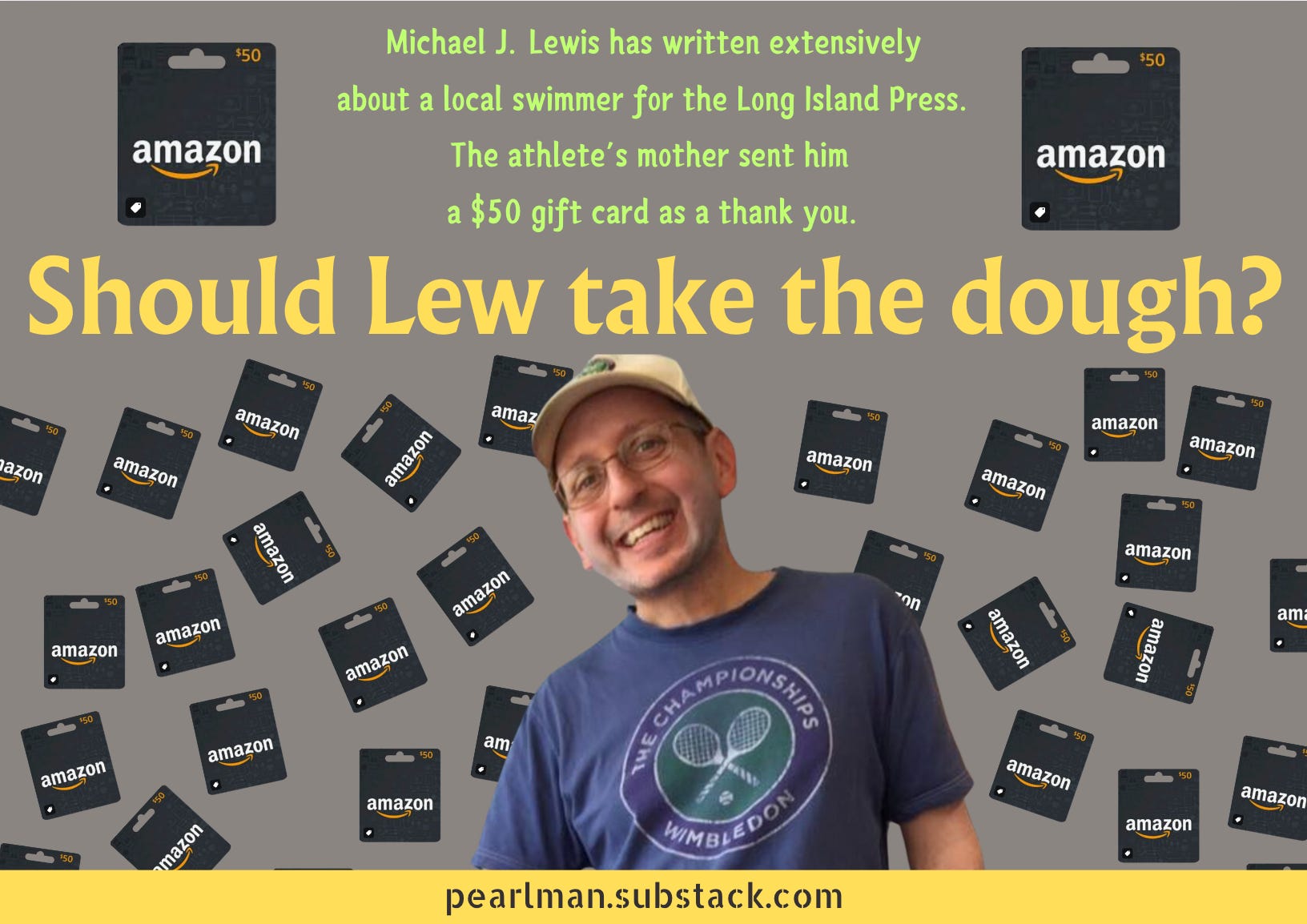 The Yang Slinger: Vol. XCV:He's a poorly paid writer who was presented with a $50 Amazon gift card by an appreciative parent. Is it OK—as a journalist—to accept the present?If you follow my career or this Substack, you know one of my all-time favorite people and journalists is Michael J. Lewis, a New York-based sports writer not to be confused with “Moneyball” Michael Lewis. Lew and I go way back—when I was a senior and editor of the University of Delaware’s student newspaper, Lew was a perky freshman scribe in a jeans jacket with a ridiculous JETS pendant dangling from his neck. He was spunky and eager and extremely talented, and through the years we’ve forged a kinship that I’ve long valued (Plus, his blog—yes, blog!—remains a joy to read). Best of all, Lew is overflowing with eternal journalistic quandaries. He’s just a guy who wears shit on his sleeve. And is unafraid to admit shortcomings. And bring forth awkwardness. And debate points. And … This week, he gave me a good one. So every Thursday, Lew writes a sports piece for the Long Island Press, his local newspaper. The articles highlight the exploits of area prep athletes, and they pay (hold your hats, kids!) a whopping $60 a pop. And Lew doesn’t do it for the money, per se. He does it because he loves journalism, loves hyping up local jocks, loves the grind. He’s primarily a stay-at-home dad these days, and the Press pieces allow him to keep a foot in the game while introducing the community to folks like Blake Sealy and Angel Walia. I digress. A few days ago, Lew wrote a story about an area swimmer named Natalie. It wasn’t his first article about the young woman—she’s a talented athlete worthy of Lew’s attention. Anyhow, shortly after the story ran Lew received this text from the swimmer’s mother … It was accompanied by this … And … um … eh … awkward. Really awkward. Super awkward. Insanely awkward. But, awkwardness be damned, it leads to the glorious question of the week: Is it cool/kosher/legit for Michael J. Lewis to accept the $50 Amazon gift card? Is it OK? The obvious answer is no. Like, one of the first lessons one absorbs in journalism class is that you cannot—under any circumstance—compromise your integrity. That means remaining neutral, that means avoiding bias, that means avoiding the perception of bias. So the journalist always pays for lunch, always makes their own arrangements, always steers clear of any sort of conflict. And yet … Do we? Do we really? When I posed Lew’s situation to Mike Vaccaro, the exceptional New York Post sports columnist, he texted back— “I know we’ll want to say with righteous indignation: GIVE IT BACK!” Mike didn’t stop there. “I still have two Big East tote bags from when they’d give those out if you covered the tournament,” he said. “I have eaten at the trough of free press box food plenty though not as often lately. Honestly, I’m not sure there’s much of a difference.” And it’s funny—because Mike was not alone in having conflicted/mixed feelings. Yaron Weitzman, author and longtime sports scribe, pondered my inquiry for a good spell before replying. “I definitely think it matters that it's a local kid and not, like, a superstar athlete,” he wrote. “A proud and thankful mom sending a gift card is different than, say, Nike sending a pair of sneakers after as a thank you for a glowing profile about an NBA player. I think I'd probably just thank the mom and then donate 50 bucks to a local charity or something. But, to be honest, I don't really have an issue if the freelancer just pockets the money. There's so much grey area in journalism and I've never subscribed to the whole ‘slippery slope’ thing. My approach to journalism ethics has always been more along the lines of ‘I know it when I see it.’ As an example: before he was drafted, I traveled to Israel to profile future NBA player Deni Avdija. After my last meeting with his family, his dad gave me a gift of local olive oil and wine to take back. I thanked him ... and left it with the hotel's front desk.” Before I started penning this post, Lew and I were discussing the late Bill Fleischman, our fantastic University of Delaware sports journalism professor and a man who preached (at the top of his lungs) integrity, integrity, integrity … while (cough) wearing a windbreaker he’d once received free from NASCAR, a sport he covered. I never discussed the jacket with Bill, and Bill (perhaps on purpose) never discussed the jacket with me. But there is something quirky and selective in our collective sports media behaviors: We grab sodas and snacks from the press boxes. We accept the T-shirt or hat teams hand out on designated days. We’ve attended parties thrown by various leagues and, at times, various athletes. Almost all top-shelf press conferences come with some level of grub. In short, we’re sorta walking conflicts of interests—insisting our leanings are not up for sale, yet occasionally offering the impression that, well, they are. That said, this circumstance is—in a major way—different than the press box soda tap. When teams or leagues offer, say, grub, it’s not a hyper-specific act with the intent of swaying a particular editorial viewpoint or outcome. Like, say, the Rockies and Mets are playing at Citi Field—the access to the press box dining room is offered to everyone, from Fox Sports to ESPN to the New York Times to Outkick. It has nothing (seemingly) to do with one’s article intent, and everything to do with feeding journalists stuck inside the stadium for six hours. It would be different were a journalist profiling Pete Alonso, and Alonso’s agent offered to buy the scribe a steak or hook him up with a box filled with Mets gear. But that’s not the case with press box food. Not even close. The problem(s) with Lew accepting the gift card are manifold. First, there’s the perception of someone receiving positive c