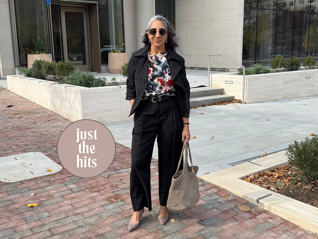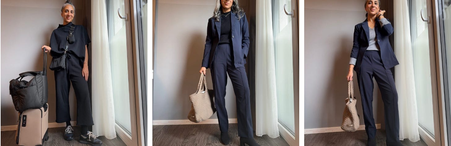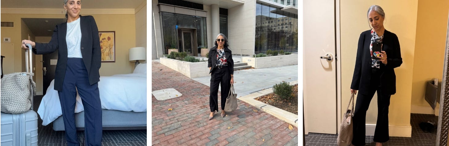 a big thanks to MM.LaFleur for dressing me for these trips! Check out their Substack, The M Dash by M.M.LaFleur. Frankfurt, 2 days. I flew in Tuesday morning and went straight into meetings that day and the next, and flew home on Thursday morning. Not shown: Lands End lightweight puffer (kept me warm for the brief moments I was outside). Washington, DC (for The Gathering) and New Orleans (for our team offsite and clinical advisory board meeting). Travel day: MM.LaFleur jardigan and pants, ABLE t-shirt, Atoms sneakers, Naghedi bag, Beis suitcase Speaking at The Gathering: MM.LaFleur top, pants, blazer, and heels. Naghedi bag. Clinical advisory board meeting: MM.LaFleur top, pants, jardigan, and heels. Naghedi bag.
